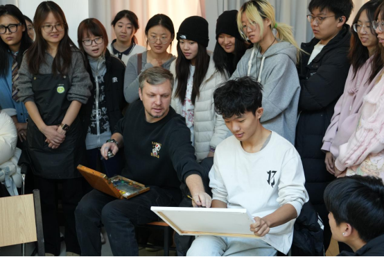 讲座活动前,潘克拉托夫走进学生课堂,开展了“大师课堂”现场教学与交流活动。他针对学生们在专业学习与创作实践中遇到的具体问题,进行了细致答疑和面对面指导,通过现场演示与个性化建议,使学生们对构图原理与艺术表现有了更直观和深入的理解。活动现场互动热烈,学生们纷纷表示受益匪浅。